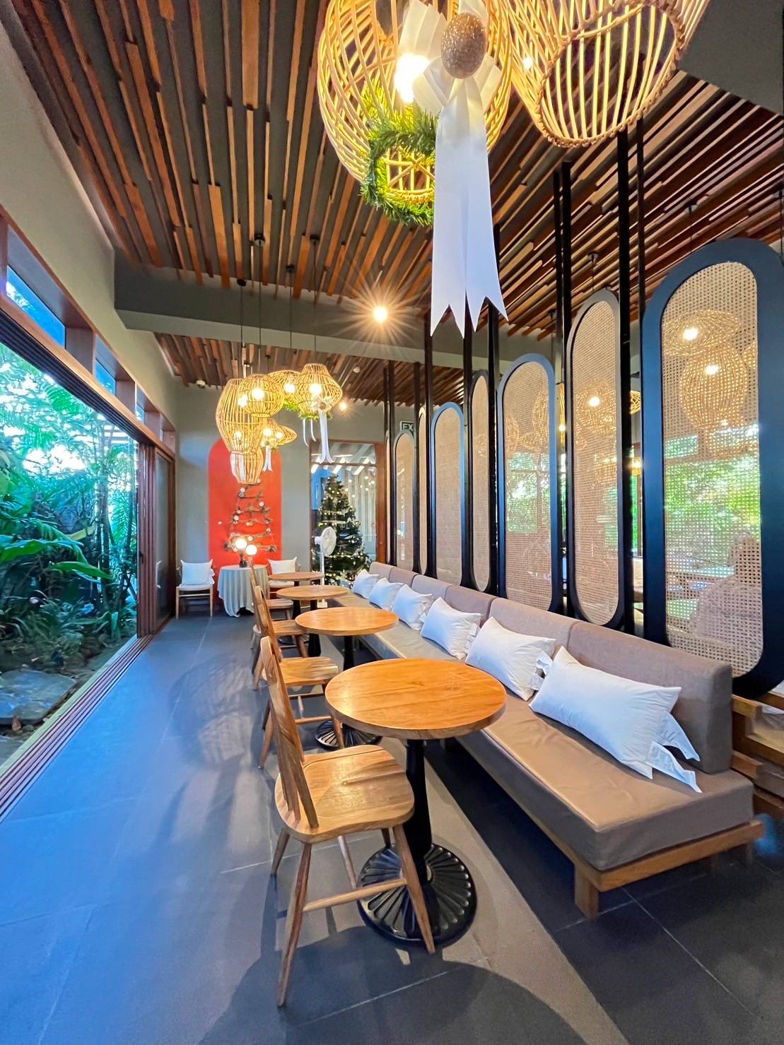 A café where you can relax with delicious food, drinks, and desserts in a cozy atmosphere by the Mekong River. The space feels open, simple, and calming. It's perfect for those looking to unwind and enjoy a peaceful dining experience.